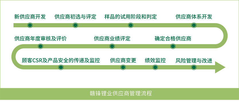 赣锋锂业高度重视锂供应链的安全,因为这直接关系到新能源产业的发展。我们将可持续发展的理念纳入采购流程,积极采购环境友好型产品,并制定《供应商行为准则》,从守法经营、合规用工、资源消耗、排放控制、健康与安全、商业道德等方面引导和规范供应商行为。赣锋锂业坚持以可持续发展为导向的责任供应链决策,积极探索责任供应链塑造工作,承担产业上下游的责任传递,降低产业链上社会与环保风险,确保产业经济价值与环境价值的双重实现。