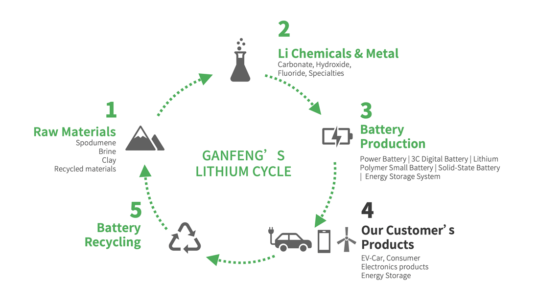 Ganfeng's lithium resources are located in several countries and regions worldwide, and we have advanced technologies for 'lithium extraction from brine', 'lithium extraction from ore', and 'lithium recycling'. Our production capacity of lithium compounds and lithium metals is among the highest in the world. Ganfeng also has the capacity to manufacture and recycle batteries, providing EVs, battery, and electronics OEMs with raw material supply, battery customization, and recycling solutions.